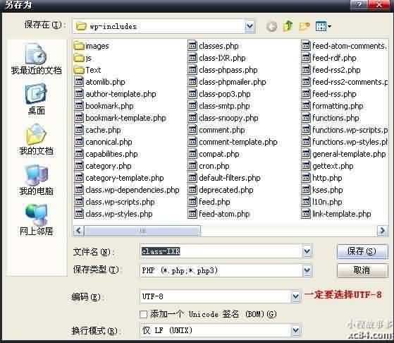 注意:在修改的时候请使用专业点的文档编辑软件,不要用记事本修改,因为最后在保存的时候需要另存为“UTF-8”的格式,不然会出错的!这一点在新克蘭德的博客并没有提到,可这是极其重要的一步,望大家一定要记住!!大家可以使用EmEditor编辑软件(点击下载),很不错,小程我一直在使用。